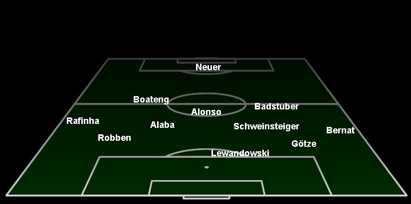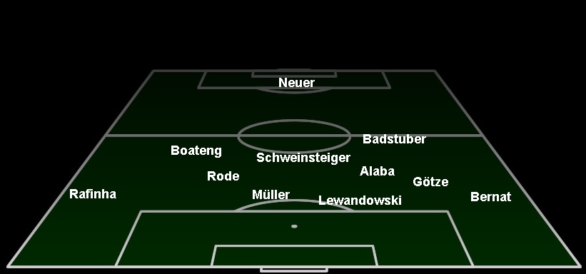 Bernat aussen, und Müller mit Lewandowski. Davor ein passschwaches und