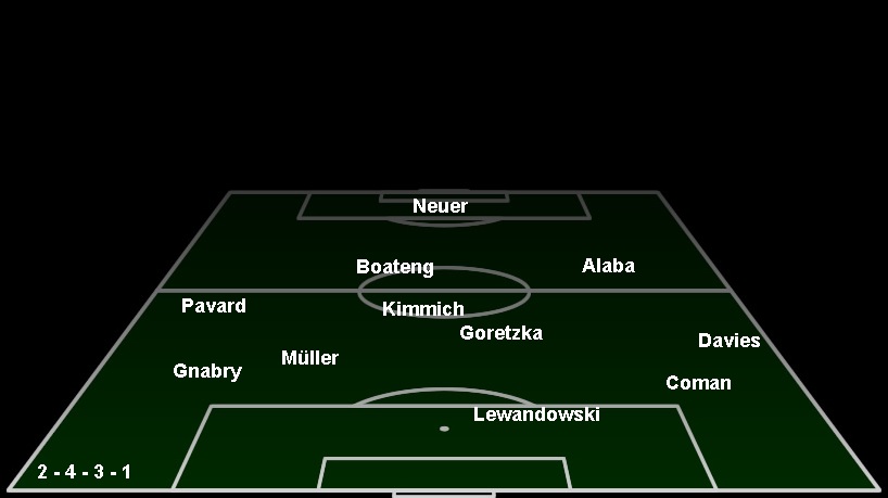 Flick wie immer mit Grundsystem 4-2-3-1, quasi gleiche Ausrichtung. Real90-Formation diesmal fast wieder mehr 4er-Kette aufgrund der hohen Dichte von Leverkusener Spieler im Mittelfeld. Allerdings lud dies (siehe bei "Offensive-Teil) ein für Ein-Pass-Angriffe. Ein eröffnendes 4-6-0 wechselte binnen 2-3 Pässen in ein variables 4-2-1-3-Kontersystem. Viel taktische Kniffe bedarf es hier eigentlich nicht. Flick hätte auch einen Kaffee trinken gehen können. Leverkusen-Coach Bosz übernahm für den FC Bayern die Angriffsstrategie sozusagen.