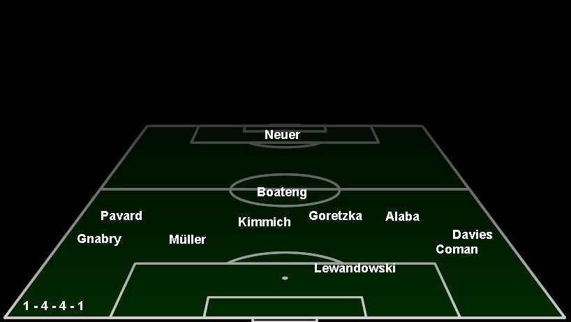 Flick schob diesmal Alaba wieder sehr weit nach vorn, quasi 3 6er (Kimmich, Goretzka, Alaba) vor Last Man Standing Boateng. Es ergab sich aus dem Grundsystem 4-2-3-1 wie schon mal in dieser Saison ein sehr hochstehendes von Werder Bremen "erlaubtes" 1-4-4-1.